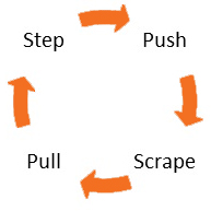 Eerst duw je het pedaal naar beneden met je bovenbeenspieren, daarna "schraap" je het pedaal naar achteren en activeer je je kuitspieren. Dan komt de opwaartse beweging, die wordt gepowered door je kuitspieren en hamstrings. Tenslotte komt de voorwaartse beweging waarmee van de trek- naar de duwbeweging gaat. Hierbij span je je bilspieren aan.