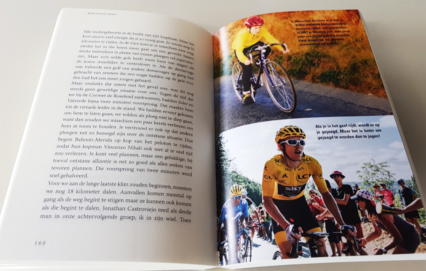 Je leest overigens niet alleen over zijn leven óp de fiets, maar ook over wat meer over het leven ernaast. Zijn vrouw Sara komt ook aan het woord. Sommige hoofdstukken over de tour etappes zijn namelijk voorzien van kleine hoofdstukjes waarin mensen rondom Geraint, ook wel G. genoemd, aan het woord worden gelaten. Zo lezen we het verhaal hoe zijn vrouw Sara de tourwinst van haar wielrennende wederhelft ervoer, maar ook de gedachtes van Rod Ellingworth en Tim Kerrison, respectievelijk ploegbaas en hoofd Athlete Performance bij team SKY. Niet echt onmisbare hoofdstukjes om eerlijk te zijn, maar leuk om te lezen dat zij het hem allemaal zo gunnen.